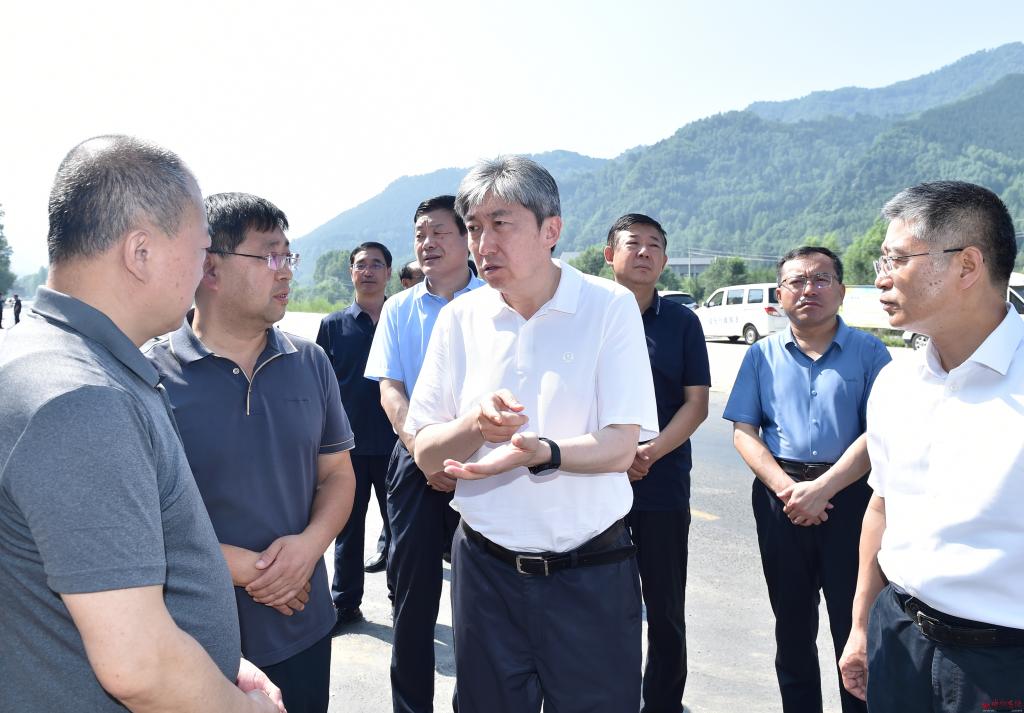 在金崗庫(kù)鄉(xiāng)蛤蟆石村。馮曉磊 攝 朱曉東先后來(lái)到滄榆高速忻阜段阜平方向K285+500處、金崗庫(kù)鄉(xiāng)蛤蟆石村、石咀鎮(zhèn)污水廠橋等地,認(rèn)真聽取有關(guān)工作匯報(bào),實(shí)地察看塌陷路段搶修進(jìn)展情況,詳細(xì)了解道路通行、交通安全隱患風(fēng)險(xiǎn)點(diǎn)排查、防汛排澇準(zhǔn)備、河道行洪安全、地質(zhì)災(zāi)害防范等情況,并提出工作要求。