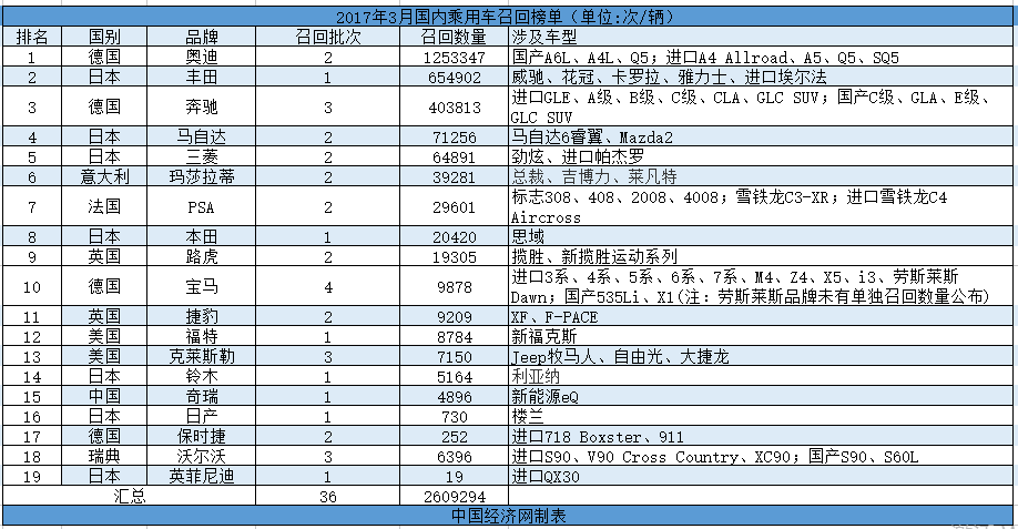 根據(jù)國家質(zhì)檢總局缺陷產(chǎn)品管理中心3月份發(fā)布的召回公告,中國經(jīng)濟(jì)網(wǎng)汽車頻道經(jīng)過匯總、統(tǒng)計,整理出“3月國內(nèi)乘用車召回榜單”。3月份,中國汽車市場內(nèi)共有21個汽車品牌發(fā)布了累計36次召回公告,共計召回2609294輛汽車。