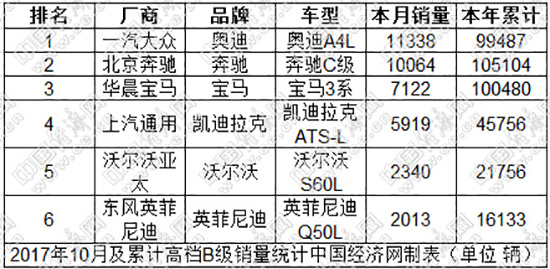 其中,奧迪追趕的步伐仍在繼續(xù),A4L已連續(xù)三個(gè)月蟬聯(lián)高檔B級車市場冠軍,10月份銷售11338輛,并穩(wěn)穩(wěn)地保持住月銷萬輛的市場能力,與榜首奔馳C級的累計(jì)銷量差距約為5500輛,未來兩個(gè)月仍有反超的希望。