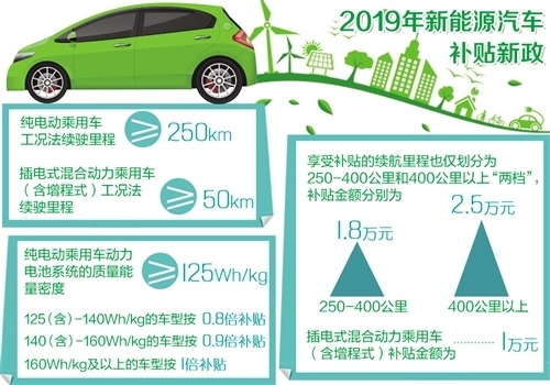 2019年新政提出:純電動(dòng)乘用車工況法續(xù)駛里程不低于250公里,插電式混合動(dòng)力乘用車(含增程式)工況法續(xù)駛里程不低于50公里,享受補(bǔ)貼的續(xù)航里程也僅劃分為250至400公里和400公里以上“兩檔”,補(bǔ)貼金額分別為1.8萬(wàn)元和2.5萬(wàn)元,插電式混合動(dòng)力乘用車(含增程式)補(bǔ)貼金額為1萬(wàn)元。