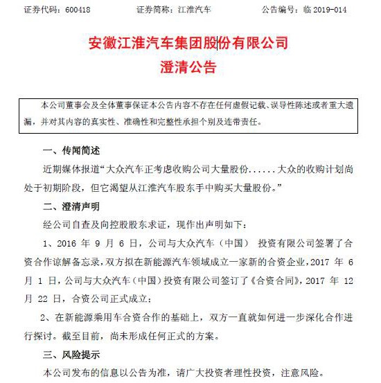 原標(biāo)題:江淮辟謠大眾收購股份傳聞,稱未形成任何正式方案