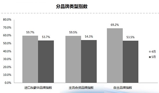 從數(shù)據(jù)上看,5月北區(qū)庫(kù)存預(yù)警指數(shù)為54.7%,東區(qū)指數(shù)為49.4%,南區(qū)指數(shù)58%,西區(qū)指數(shù)56.9%。分品牌來看,5月進(jìn)口&豪華品牌指數(shù)、合資品牌指數(shù)、自主品牌指數(shù)較上月下降;另由于部分省市7月1日提前實(shí)施國(guó)六標(biāo)準(zhǔn),5月經(jīng)銷商加大了對(duì)國(guó)五車清庫(kù)力度,總體庫(kù)存水平有所下降。