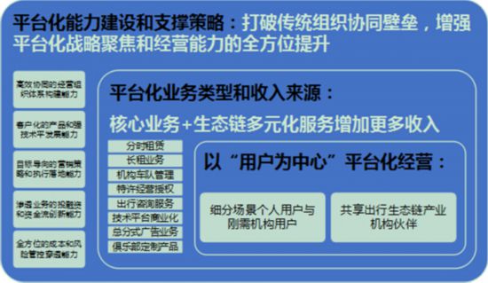 二是平臺化業(yè)務類型和收入來源,除了目前分時租賃、長租外,機構(gòu)車隊管理、特許經(jīng)營授權(quán)、出行咨詢服務、IT平臺應用商業(yè)化、總分式廣告業(yè)務、會員俱樂部定制化產(chǎn)品等就是產(chǎn)業(yè)鏈收入新來源。