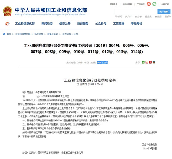 經(jīng)濟日報-中國經(jīng)濟網(wǎng)10月8日訊(記者 郭躍)今日,工業(yè)和信息化部(以下簡稱“工信部”)發(fā)布公告,對11家不符合《道路機動車輛生產(chǎn)企業(yè)及產(chǎn)品公告》(以下簡稱《公告》)管理中關(guān)于生產(chǎn)一致性管理相關(guān)規(guī)定的公司進(jìn)行行政處罰。處罰內(nèi)容包括停止以上11家公司生產(chǎn)和銷售違規(guī)產(chǎn)品,并撤銷產(chǎn)品《公告》;責(zé)成以上公司進(jìn)行為期6個月的整改;同時,整改期間暫停公司《公告》新產(chǎn)品申報資格。