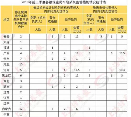 2019年前三季度各銀保監(jiān)局車險行政處罰情況統(tǒng)計(jì)表