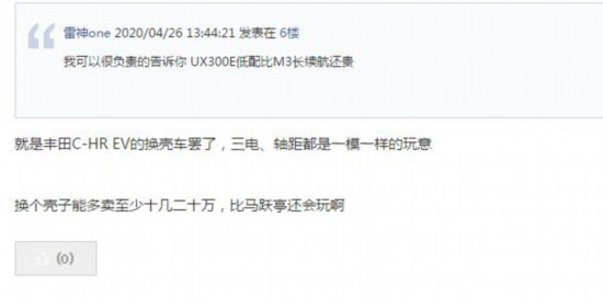 此外,雷克薩斯上月推出的首款純電車型UX300e,新車售價(jià)超出30萬元,根據(jù)補(bǔ)貼新政,今年7月22日后將無法享受新能源補(bǔ)貼。同時(shí),從論壇上消費(fèi)者的反應(yīng)來看,對其似乎也不:太看好,不禁讓人對雷克薩斯在華電動(dòng)車“頭炮”能否打響產(chǎn)生擔(dān)憂。