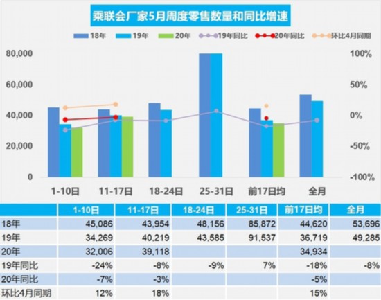 乘聯(lián)會(huì)20日發(fā)布的數(shù)據(jù)顯示,5月第二周(11-17日)的乘用車市場(chǎng)零售表現(xiàn)改善,環(huán)比增長(zhǎng)18%,相對(duì)前期5月第二周的環(huán)比增長(zhǎng)放緩的情況,今年的5月零售走勢(shì)回暖的態(tài)勢(shì)明顯。
