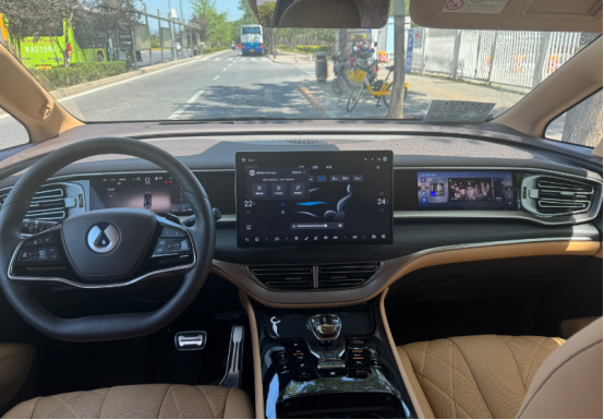 進入車內(nèi),騰勢D9以“雙色豪華”為主題,提供云峰棕、曠達(dá)米等多元配色方案,搭配山海百納真木飾板與NAPPA真皮座椅,營造出媲美百萬級豪車的座艙氛圍。中控臺采用15.6英寸懸浮式大屏與10.25英寸全液晶儀表的組合,搭載騰勢Link超智能交互系統(tǒng),支持全場景語音控制、多屏共享及10種情景模式切換,操作流暢度與響應(yīng)速度均達(dá)到行業(yè)頂尖水平。