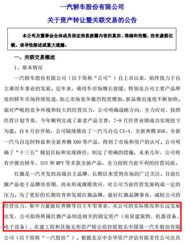 根據(jù)此前公告,一汽轎車根據(jù)資產(chǎn)評估的結(jié)果,在和一汽集團(tuán)協(xié)商一致的前提下,將評估價值為3.7億元的紅旗旗下資產(chǎn),以含增值稅人民幣 4.2億元的交易價格轉(zhuǎn)讓給一汽股份,并且表示, 本次資產(chǎn)轉(zhuǎn)讓的關(guān)聯(lián)交易已經(jīng)在第七屆董事會第七次會議中審議通過,在交易合同簽署生效后20天內(nèi)一汽股份需要向一汽轎車支付轉(zhuǎn)讓資產(chǎn)價款。這意味著,紅旗品牌已歸屬于一汽股份所有,從一汽轎車中獨(dú)立出來。(圖/文 網(wǎng)通社 陳旭明)