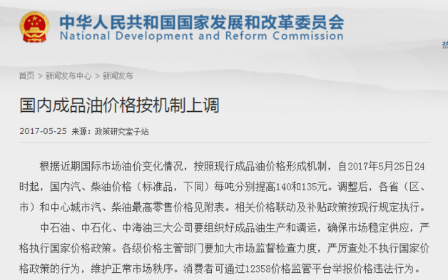 昨日(25日),國家發(fā)展和改革委員會發(fā)布消息稱,根據(jù)近期國際市場油價變化情況,按照現(xiàn)行成品油價格形成機制,自2017年5月25日24時起,國內(nèi)汽、柴油價格(標準品,下同)每噸分別提高140和135元。相關(guān)價格聯(lián)動及補貼政策按現(xiàn)行規(guī)定執(zhí)行。