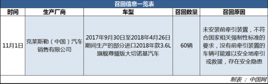本次召回范圍內(nèi)的車輛未安裝前牽引裝置,不符合國(guó)家相關(guān)強(qiáng)制性標(biāo)準(zhǔn)的要求,沒(méi)有前牽引裝置的車輛可能難以安全地牽引或救援,存在安全隱患??巳R斯勒(中國(guó))汽車銷售有限公司將為召回范圍內(nèi)的車輛免費(fèi)提供前牽引環(huán)并將牽引環(huán)支架安裝到車輛上,同時(shí)換上帶孔的車前下部格柵,以消除安全隱患。