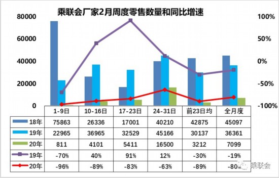 乘聯(lián)會指出,2月第一周的乘用車市場零售處于冰封狀態(tài),日均零售811輛,同比增速下降96%,銷量總體偏低。第二周的零售達到日均4100輛,同比增速下降89%,2月前兩周的零售同比下滑92%,零售市場回暖較慢。第三周的零售達到日均5411輛,同比增速下降83%,第三周環(huán)比第二周零售增長32%。第四周的零售達到日均1.6萬輛,同比增速下降63%。