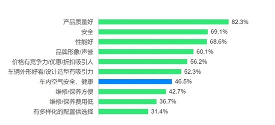 消費(fèi)者前三大購車考慮因素是質(zhì)量(82.3%)、安全(69.1%)和性能(68.6%),但疫情使車內(nèi)空氣安全和健康上升成為購車時的又一考量重點(diǎn)(46.5%)。