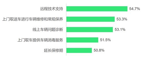 特殊時期,車主希望汽車品牌和經(jīng)銷商提供遠(yuǎn)程技術(shù)支持(54.7%)和線上車輛問題診斷服務(wù)(53.1%),以盡量減少進(jìn)店頻次。線上服務(wù)需求對廠商的數(shù)字化能力提出了更高的要求。此外,五成車主希望經(jīng)銷商提供上門取送車保養(yǎng)或消毒服務(wù),經(jīng)銷商應(yīng)把握上門服務(wù)機(jī)會,創(chuàng)造新的服務(wù)需求。