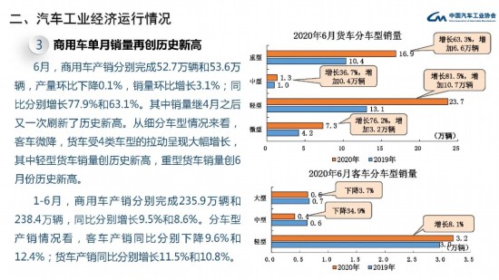 6月,商用車產(chǎn)銷52.7萬輛和53.6萬輛,產(chǎn)量環(huán)比下降0.1%,銷量增長3.1%,同比增長77.9%和63.1%。在商用車主要品種中,與上月相比,貨車產(chǎn)量微降,銷量呈小幅增長,客車產(chǎn)銷均呈增長;與上年同期相比,客車產(chǎn)銷略有下降,貨車產(chǎn)銷增速依然顯著。