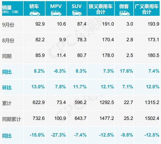 分車型來看,9月,SUV與轎車市場依舊維持較高增速,均實現(xiàn)超過8%的同比增長,環(huán)比增長也同為兩位數(shù)。而MPV市場則獨自低迷,再現(xiàn)同比下滑走勢。