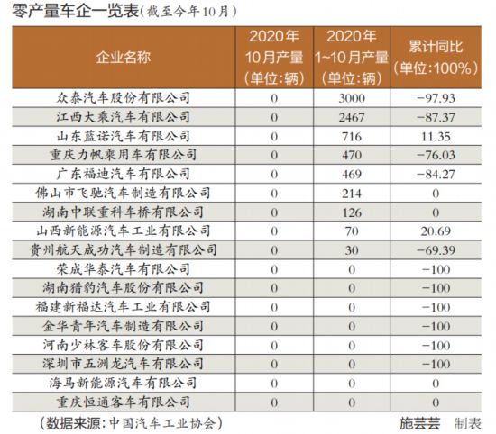 正如蔡榮華所言,我國汽車產(chǎn)銷量占全球30%左右,企業(yè)競(jìng)爭(zhēng)日趨激烈,但是盲目投資、產(chǎn)能利用率比較低的問題尚未得到有效解決?!吨袊嚬I(yè)產(chǎn)銷快訊》(2020年第11期)數(shù)據(jù)顯示,在總共被統(tǒng)計(jì)的88家汽車企業(yè)中,今年10月汽車產(chǎn)量為零的汽車企業(yè)竟然多達(dá)17家(事實(shí)上,這一數(shù)據(jù)在8月為16家),今年前10個(gè)月產(chǎn)量低于500輛的共有25家,其中,有8家生產(chǎn)企業(yè)今年未生產(chǎn)過1輛汽車,占比接近一成。