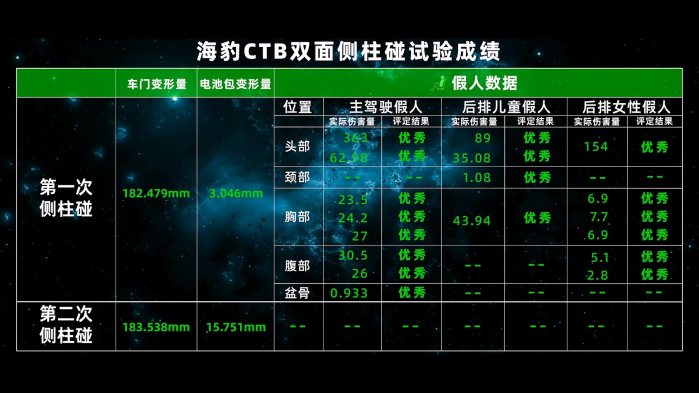 搭載CTB電池車身一體化技術(shù)的比亞迪海豹在TOP Safety雙面?zhèn)戎鲈囼?yàn)中,挑戰(zhàn)了主駕駛側(cè)柱碰試驗(yàn),副駕駛后排側(cè)柱碰試驗(yàn),以及兩次側(cè)柱碰后的電池包復(fù)用試驗(yàn),順利通過了挑戰(zhàn)。