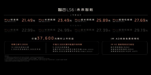 網(wǎng)通社快訊  10月12日,智己LS6正式上市,4款車型官方指導(dǎo)價(jià)為22.99萬-29.19萬元,上市期限時(shí)鉅惠立減1.5萬元。也就是說,“2023年11月12日24點(diǎn)前鎖單,并在2023年內(nèi)支付車款”的用戶,可享受限時(shí)售價(jià)區(qū)間為21.49萬-27.69萬元。另外,上市權(quán)益還包括:贈(zèng)送價(jià)值2.26萬元豪華配置升級(jí)特惠和IM AD終身免費(fèi)使用權(quán)。