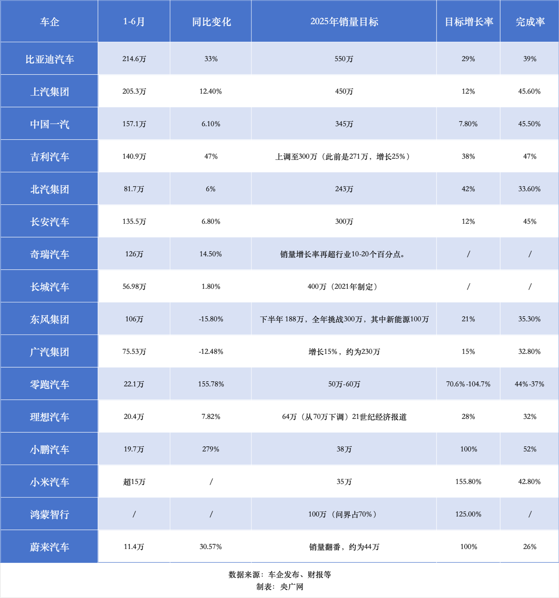 央廣網(wǎng)統(tǒng)計的各大汽車集團、車企公布的銷量數(shù)據(jù),目前,蔚來汽車的目標完成率低于30%,比亞迪汽車、北汽集團、東風集團、廣汽集團、理想汽車5家車企的目標完成率在30%-40%之間,上汽集團、中國一汽、吉利集團、長安汽車、零跑汽車、小鵬汽車、小米汽車7家車企的完成率超過40%。此外,奇瑞集團、長城汽車、鴻蒙智行等因數(shù)據(jù)不完善此次不計入統(tǒng)計。