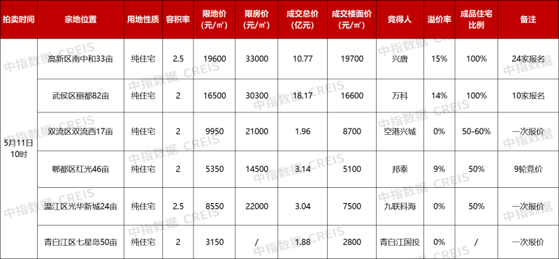 據(jù)中指研究院監(jiān)測,本次出讓中,只有2宗宅地位于主城區(qū),其獲得關(guān)注熱度高、參拍企業(yè)多。最終,高新區(qū)南中和33畝宗地和武侯區(qū)麗都82畝宗地價(jià)格達(dá)到觸頂“熔斷”,分別由興唐地產(chǎn)和萬科以樓面價(jià)19700元/平方米、16600元/平方米搖中。