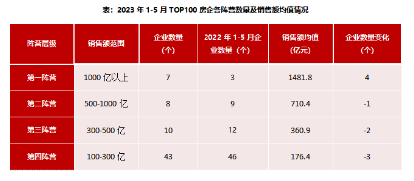 同時(shí),1-5月,千億以上陣營(yíng)企業(yè)數(shù)量增加。具體來(lái)看,千億以上陣營(yíng)7家,較去年同期增加4家,銷售額均值1481.8億元。第二陣營(yíng)(500-1000億元)企業(yè)8家,較去年同期減少1家,銷售額均值710.4億元。第三陣營(yíng)(300-500億元)企業(yè)10家,較去年同期減少2家,銷售額均值360.9億元。第四陣營(yíng)(100-300億元)企業(yè)為43家,較去年同期減少3家,銷售額均值176.4億元。