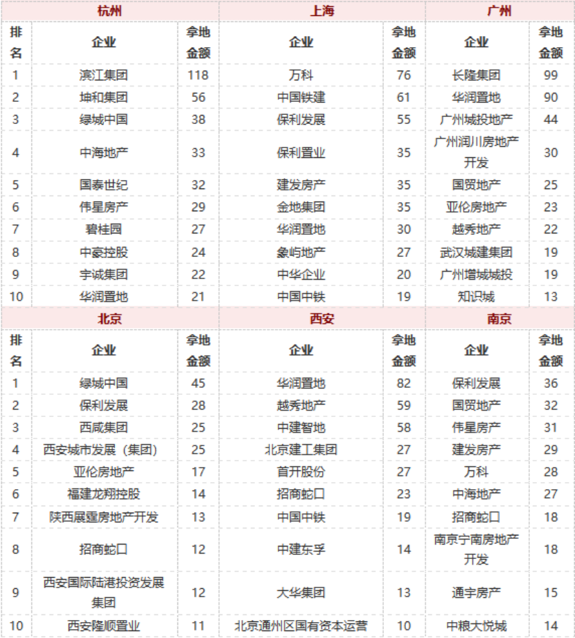 此外,民營(yíng)房企也在加速回歸,深耕房企增儲(chǔ)訴求明確。劉水提到,自三月以來(lái),龍湖分別在深圳、合肥、長(zhǎng)沙、上海、杭州、天津等地拿地,企業(yè)也表示將堅(jiān)持按照20個(gè)主力城市和14個(gè)機(jī)會(huì)城市來(lái)布局,聚焦城市的核心區(qū)域;4-5月,碧桂園先后在佛山、太原、杭州競(jìng)得五塊地塊。