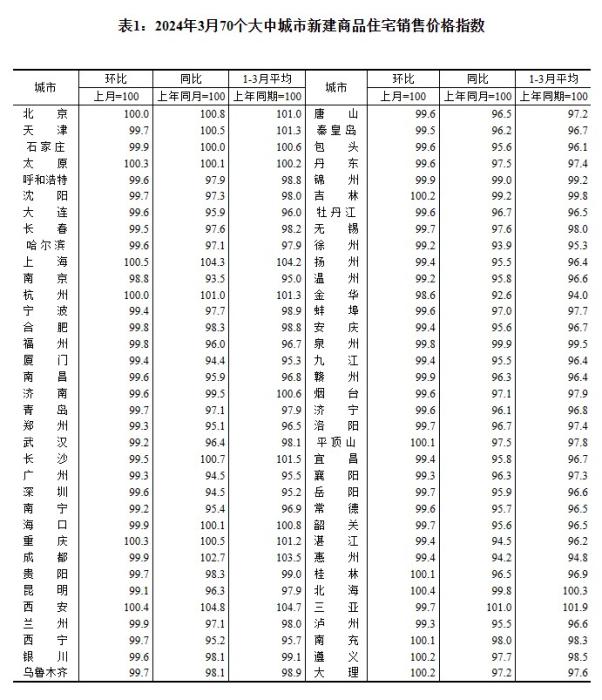 2024年3月70個(gè)大中城市新建商品住宅銷售價(jià)格指數(shù)。 截圖自國家統(tǒng)計(jì)局官網(wǎng)