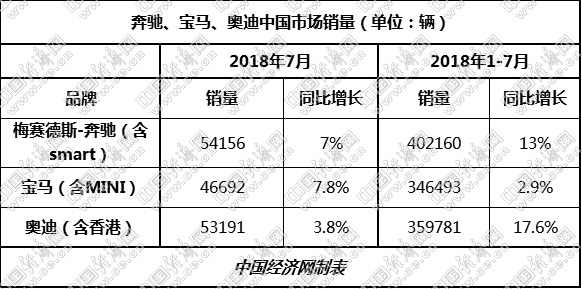 就數(shù)據(jù)而言,ABB三家無論是7月當(dāng)月還是前7月,均保持著正向增長。其中,奔馳、寶馬給出的定義是“穩(wěn)健”、“平穩(wěn)”增長,奧迪則是收獲了“在華最好7月”。在競爭格局上,三家品牌也并未有大的變化,依舊維持著年初以來的座次:奔馳繼續(xù)保持領(lǐng)先,奧迪加速追趕,寶馬則是按照既定目標(biāo)一路向前。