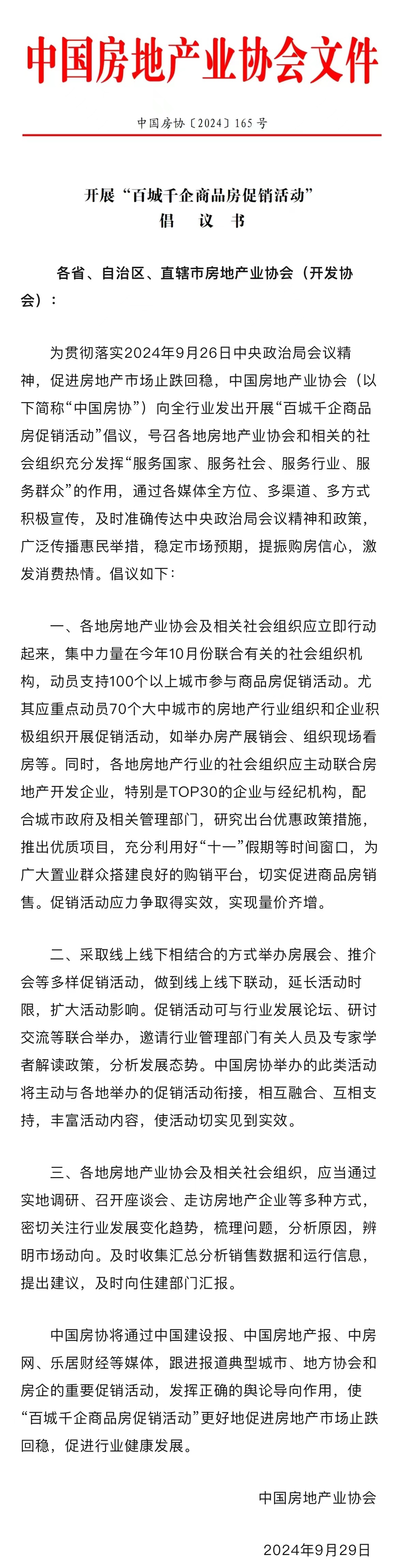 央廣網(wǎng)北京10月11日消息(記者安垚)據(jù)中國(guó)房地產(chǎn)業(yè)協(xié)會(huì)微信公眾號(hào)消息,為貫徹落實(shí)9月26日中央政治局會(huì)議精神,促進(jìn)房地產(chǎn)市場(chǎng)止跌回穩(wěn),在住房和城鄉(xiāng)建設(shè)部的指導(dǎo)下,9月29日,中國(guó)房地產(chǎn)業(yè)協(xié)會(huì)(以下簡(jiǎn)稱“中國(guó)房協(xié)”)發(fā)出開(kāi)展“百城千企商品房促銷活動(dòng)”倡議。