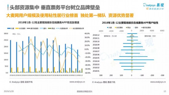 2019年3月20日,易觀發(fā)布《2018中國現(xiàn)場娛樂票務市場年度綜合分析》(以下簡稱“報告”)。報告顯示,2018年大麥網(wǎng)APP端月均活躍人數(shù)達237.3萬人,月均使用次數(shù)達2165.4萬次,月均使用時長89.9萬小時,從用戶規(guī)模和使用粘性上均居行業(yè)榜首,遠高于其它票務平臺總和,獨處第一梯隊,在市場充分競爭的情況下,為內容方、場館和用戶等生態(tài)相關方提供著獨一無二的現(xiàn)場綜合服務。