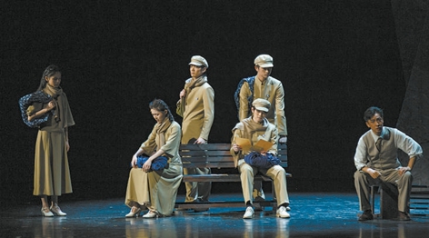 舞美設(shè)計需要構(gòu)建出復(fù)雜廣闊的時間和空間內(nèi)容范疇。多組道具營造出了多層次的視覺空間,結(jié)合話劇本身的語言邏輯共同推進情節(jié),有回溯有瞻望。舞臺上三組沿幕側(cè)幕,以扭曲傾倒的造型和鐵銹斑斑的質(zhì)感,營造出危險動蕩的革命時代氛圍。對于影響新中國文藝發(fā)展歷程的幾部經(jīng)典作品,通過呈現(xiàn)其創(chuàng)作過程,指向漸趨明朗的人物命運。相隔數(shù)年、不同角色的命運情境得以靈動地銜接、組合,人物在時空中不斷跳進跳出,實現(xiàn)敘述的自由。