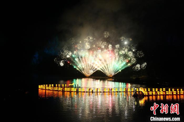 慶典演出現(xiàn)場人頭攢動(dòng),開場無人機(jī)表演在半空組合出紀(jì)念“印象劉三姐20年”的圖案,舞臺(tái)上擊鼓而舞的表演者渲染歡樂氛圍。以絢爛煙火為背景,漁翁表演者在江面組成蜿蜒長龍,引得游客們紛紛贊嘆拍照。慶典演出環(huán)節(jié),桂林旅游學(xué)院和《印象·劉三姐》的演員們共同表演的舞蹈《漓江·春茶》、百人合唱《侗族大歌》、實(shí)景展演《龍騰印象》等精彩節(jié)目,帶來一場視覺盛宴。