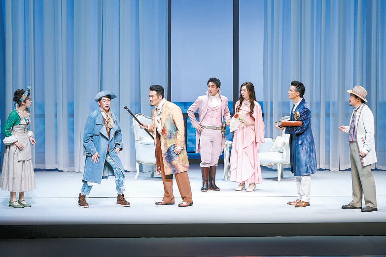 “在保留原作時(shí)代風(fēng)貌的基礎(chǔ)上,我們期待能進(jìn)行現(xiàn)代視角的轉(zhuǎn)譯,讓這部經(jīng)典作品煥發(fā)出更輕快時(shí)尚的舞臺(tái)表達(dá)?!眹?guó)家大劇院副院長(zhǎng)張堯說(shuō)。這一版《一仆二主》集結(jié)了中國(guó)國(guó)家話劇院導(dǎo)演王劍男、舞美設(shè)計(jì)張華翔等主創(chuàng)藝術(shù)家,由董汶亮、楊淇、郭爍杰、孫立石等國(guó)家大劇院戲劇演員隊(duì)演員出演。他們首先呈現(xiàn)了《一仆二主》原作靈巧詼諧的精髓,將角色間環(huán)環(huán)相扣的“信息差”層層剝開。