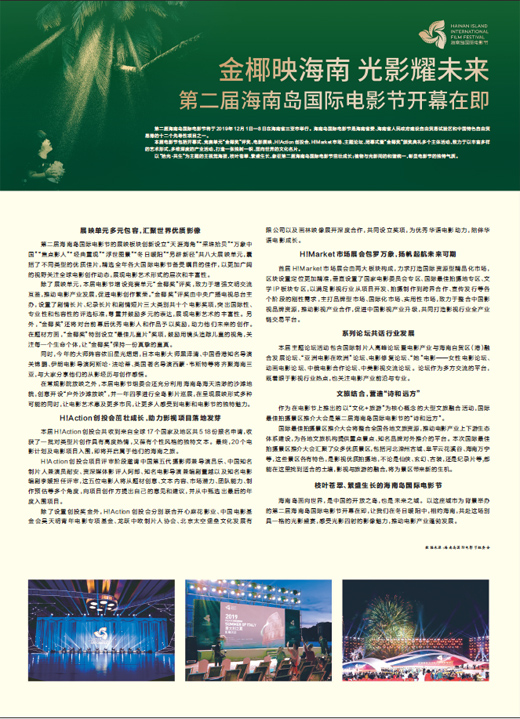 第二屆海南島國際電影節(jié)將于2019年12月1日—8日在海南省三亞市舉行。海南島國際電影節(jié)是海南省委、海南省人民政府建設(shè)自由貿(mào)易試驗(yàn)區(qū)和中國特色自由貿(mào)易港的十二個(gè)先導(dǎo)性項(xiàng)目之一。