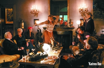 在結(jié)構(gòu)與人物之外,《利刃出鞘》的主題也頗值得思索。電影中,偵探布蘭科關(guān)于“甜甜圈”有一段表述,大意是講,真相有時就像一個甜甜圈,看似結(jié)構(gòu)完整,實際上卻還有一個大洞位居其中。而電影里暗含的“甜甜圈”式的隱喻也很多:哈蘭本可以不死,卻因自陷于偵探故事的“甜甜圈”套路而殞命;兇手在一個狀似巨型“甜甜圈”的刀具架上選擇兇器,卻沒有拿到一把真的刀;反而女主角瑪塔能夠最終戰(zhàn)勝狡猾的兇手,是因為她在關(guān)鍵時刻沒有遵循案件“甜甜圈”規(guī)則內(nèi)既定的正確選擇。電影《利刃出鞘》似乎不滿足于將主題止步在推理電影一般的真相揭示和人性批判,而是還希望告訴觀眾:重要的東西往往是在“缺失的洞”內(nèi)、在閉合的規(guī)則之外?;蛟S,這也是《利刃出鞘》藝術(shù)創(chuàng)作成功的重中之重——跳出類型既有經(jīng)典的“甜甜圈”,在固定模式以外的更廣闊空間,讓主旨得到全新的升華。