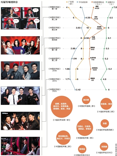 直到2018年,《中國好聲音》品牌回歸,一切看似恢復(fù)原來的模樣。但江山已逝??v觀2018、2019、2020三年的平均收視率、口碑評(píng)分和選手熱度,今年在沒有輸出至優(yōu)愛騰平臺(tái)的情況下,綜合表現(xiàn)竟然超過了前兩年。但在“影視話題晴雨表”的豆瓣上,這一季的評(píng)分人數(shù)僅2800余人,只有八年前的十分之一而已。