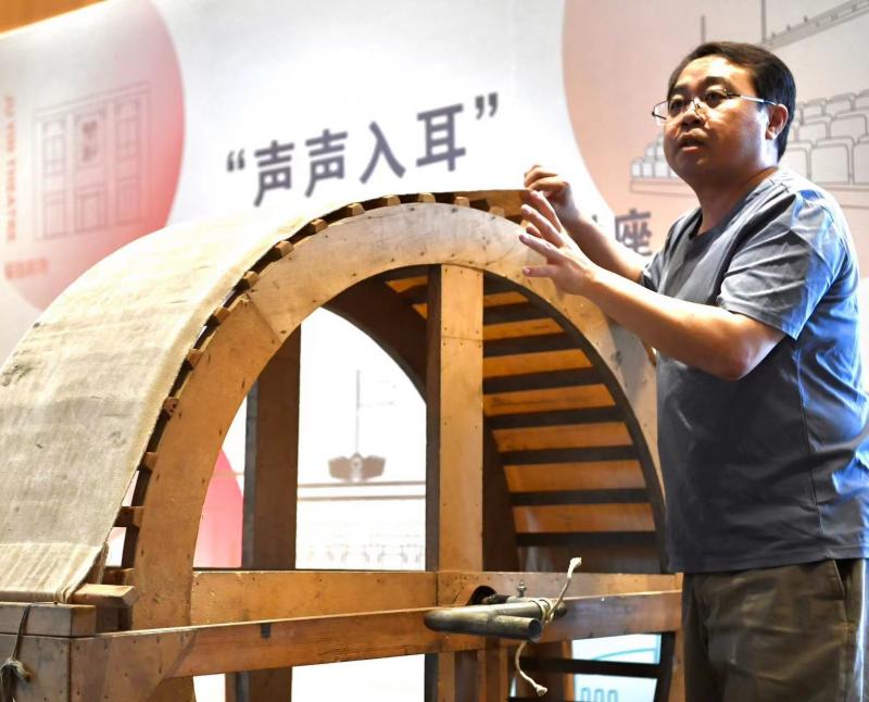 而看起來并不起眼的兩片三合板則是悶雷效果的制造者,隨著晃動,依靠空氣的震動,“雷聲”一聲緊似一聲,而這也成為經(jīng)典話劇《雷雨》中最重要的音效。雨聲則是靠扇子上串珠子的晃動營造出大珠小珠落玉盤的效果。據(jù)悉,早年間演出時,后臺的畫面也十分震撼,十幾個人一人拿一塊板子分兩側(cè)而立形成矩陣,在指揮的引導(dǎo)下次第晃動,鄭晨說,“在沒有電聲、沒有便攜錄音設(shè)備的年代,一場《雷雨》因此也生動傳神?!?/p>