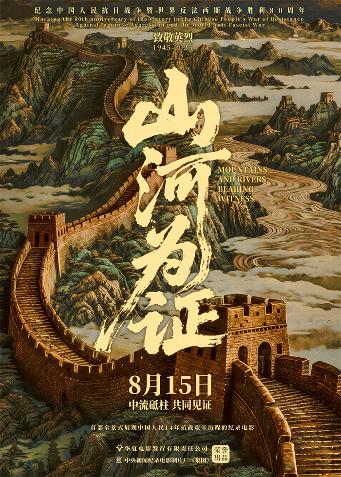 在紀(jì)念中國(guó)人民抗日戰(zhàn)爭(zhēng)暨世界反法西斯戰(zhàn)爭(zhēng)勝利80周年的重要?dú)v史時(shí)刻,紀(jì)錄電影《山河為證》正式宣布定檔,將于2025年8月15日登陸全國(guó)院線。影片由華夏電影發(fā)行有限責(zé)任公司與中央新聞紀(jì)錄電影制片廠(集團(tuán))出品,同步發(fā)布定檔版海報(bào)。