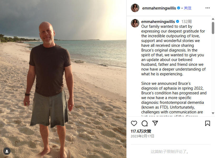 2022年,布魯斯·威利斯的家人發(fā)布聯(lián)合聲明,宣布他將退出演藝事業(yè)。因為他被診斷患上失語癥,這影響了他的認知能力和溝通能力。一年后,家人再次發(fā)文透露,他的病情進一步發(fā)展,且有了更具體的診斷結(jié)果:額顳葉癡呆(FTD)。