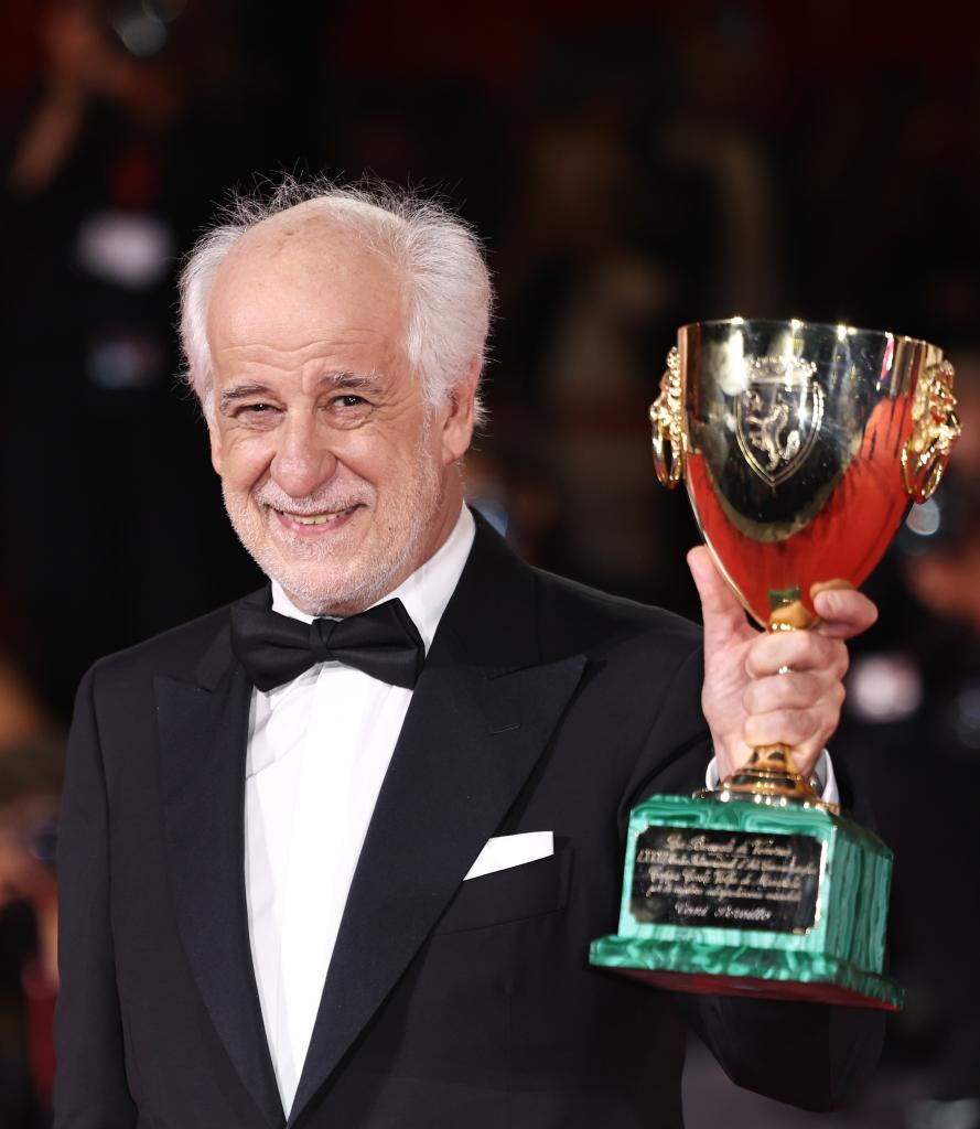 9月6日,在意大利威尼斯,最佳男演員獎(jiǎng)獲得者、電影《恩典》演員托尼·瑟維洛與獎(jiǎng)杯合影。新華社記者 李京 攝
