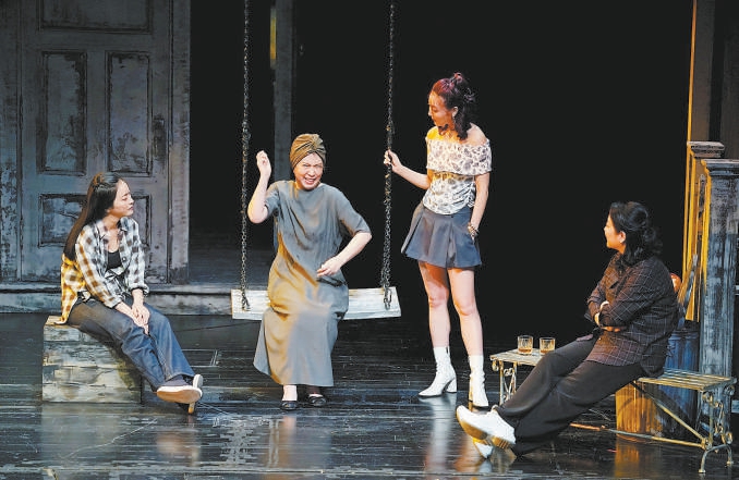 北京人藝話劇《小郡之秋》劇照,龔麗君飾演的母親(左二)與陳小藝(右一)、張培(左一)、原雨(右二)飾演的三個(gè)女兒在一起。記者 方非攝