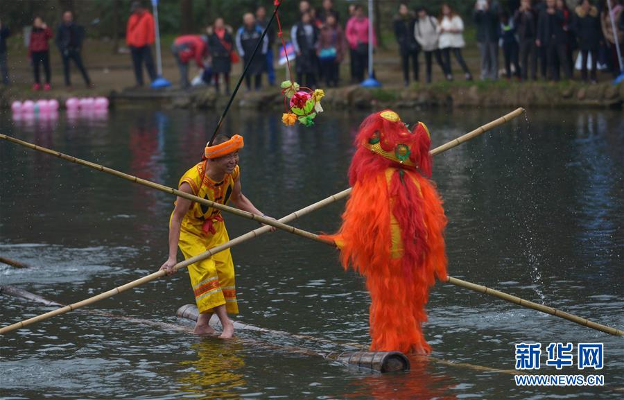 1月1日,“獨(dú)竹漂”愛好者在花溪河上表演水上高難度平衡動(dòng)作。 2016年元旦,在貴陽(yáng)市花溪公園平橋河段舉行的貴陽(yáng)市第31屆冬泳表演活動(dòng)中,數(shù)十名“獨(dú)竹漂”愛好者在花溪河上腳踏漂浮的竹竿,表演“金雞獨(dú)立”、轉(zhuǎn)身平衡等高難度動(dòng)作,讓觀眾大飽眼福。新華社發(fā)(秦剛 攝)