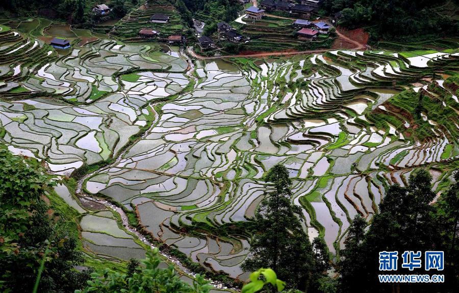 5月20日在廣西柳州市融水苗族自治縣桿洞鄉(xiāng)拍攝的梯田。廣西柳州市融水苗族自治縣桿洞鄉(xiāng)平均海拔780多米,是全縣高海拔鄉(xiāng)鎮(zhèn)之一。這里的梯田多在高山,人們稱之為“天上糧倉”。時(shí)下,“天上糧倉”或儲(chǔ)水待插,或新秧初栽,如織錦一般美不勝收。新華社發(fā)(龍濤 攝)