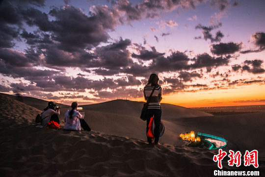 7月中旬,國際旅游名城甘肅敦煌進(jìn)入旅游旺季,每天成千上萬的海內(nèi)外游客來到當(dāng)?shù)刂Q沙山月牙泉景區(qū)觀光游覽,觀賞大漠風(fēng)光,感受敦煌文化,體驗(yàn)民俗風(fēng)情。傍晚時(shí)分,西邊的天空被晚霞染紅,美麗的月牙泉被寶藍(lán)色的燈光點(diǎn)綴著呈現(xiàn)出美輪美奐的闌珊夜色,大批游人沉浸于如夢(mèng)如幻的迷人夜色里流連忘返。