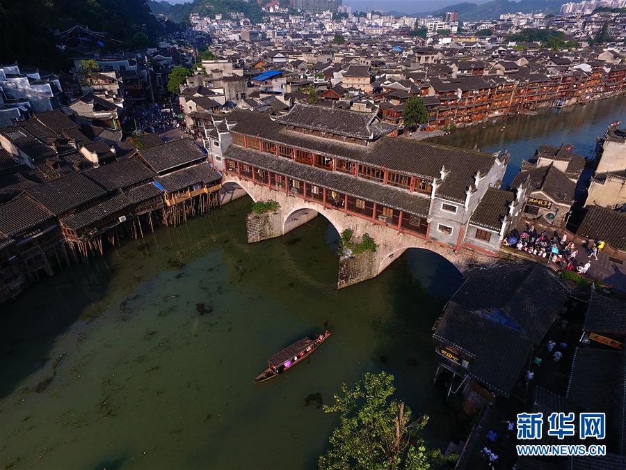 這是鳳凰古城標(biāo)志性建筑之一的虹橋全景(7月28日攝)。鳳凰古城位于湖南省湘西土家族苗族自治州鳳凰縣境內(nèi),是國(guó)家歷史文化名城。古城緊鄰沱江而建,吊腳木樓布滿山坡,風(fēng)景秀麗。 新華社記者龍弘濤 攝