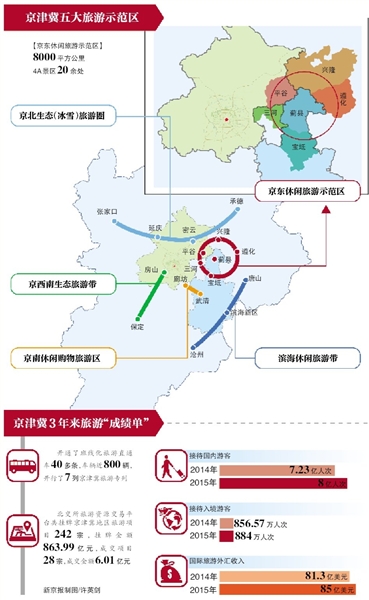 三地共同打造京東休閑旅游示范區(qū)、京北生態(tài)(冰雪)旅游圈、京西南生態(tài)旅游帶、京南休閑購物旅游區(qū)、濱海休閑旅游帶等5個(gè)旅游試點(diǎn)示范,成為三地共建旅游大格局的新標(biāo)桿。家人出城休閑度假,可以選擇京東休閑旅游示范區(qū);如果三五好友想體驗(yàn)冰雪娛樂,則可到京北生態(tài)(冰雪)旅游圈;橫跨京冀兩地的房山世界地質(zhì)公園,則是京西南生態(tài)旅游帶內(nèi)的特色景點(diǎn);而天津武清、河北廊坊則打造成為京南休閑購物旅游區(qū)。