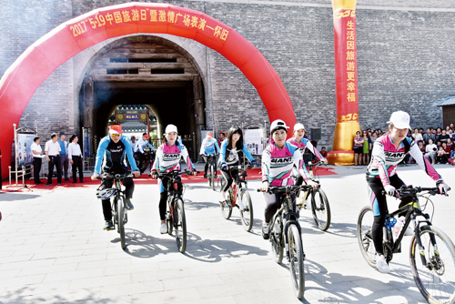 活動(dòng)中,旅行社代表發(fā)言,旅行社導(dǎo)游集體宣誓,旅行社負(fù)責(zé)人和導(dǎo)游集體簽署文明旅游承諾書。啟動(dòng)了捷安特騎行隊(duì)騎游??h文化藝術(shù)館舉辦了“激情廣場表演——懷舊專場”演出,節(jié)目有舞蹈、獨(dú)唱、晉劇選段、吉他彈奏、勁舞、歌伴舞、詩朗誦、水兵舞、旗袍秀等,贏得現(xiàn)場觀眾陣陣熱烈的掌聲,將“5·19中國旅游日”宣傳活動(dòng)推向了高潮。圖為捷安特騎行隊(duì)出發(fā)騎游(石俊文 攝影報(bào)道)