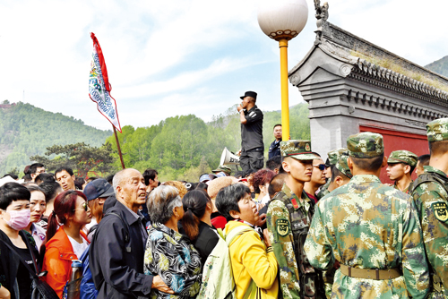 19日上午,中心區(qū)旅游人數(shù)達(dá)到峰值,五爺廟前的廣場是安保壓力最大的區(qū)域,按照活動《方案》建立了兩道隔離帶,公安民警、武警、消防、保安緊密協(xié)作,分兵把守,有序放行。在五爺廟前的焚香區(qū),武警戰(zhàn)士組成人墻迎接一浪高過一浪的人潮沖擊,確保了萬千游客的絕對安全,豆大的汗珠順著他們的臉頰不斷流淌。
