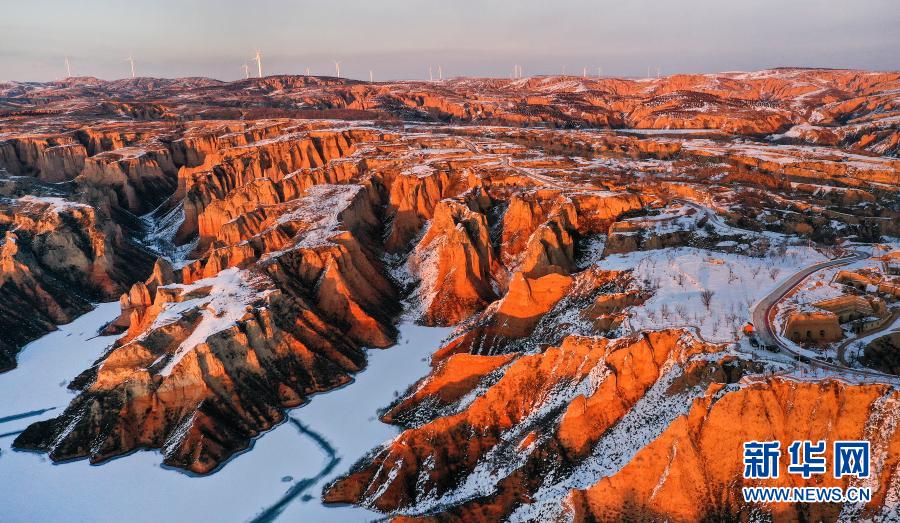 12月3日拍攝的雪后初霽的陜西省榆林市麻黃梁黃土地質(zhì)公園(無人機(jī)照片)。